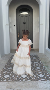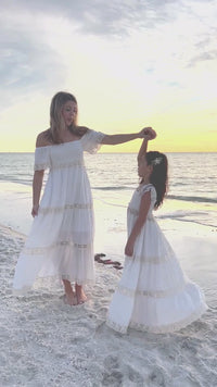 For the little dreamer with a wild heart, the Girl’s Marabella Dress in Lace is effortlessly elegant and designed for golden moments. The combination of flowing white fabric and delicate ecru lace makes it a timeless favorite for vacation memories, family photos, and special occasions.