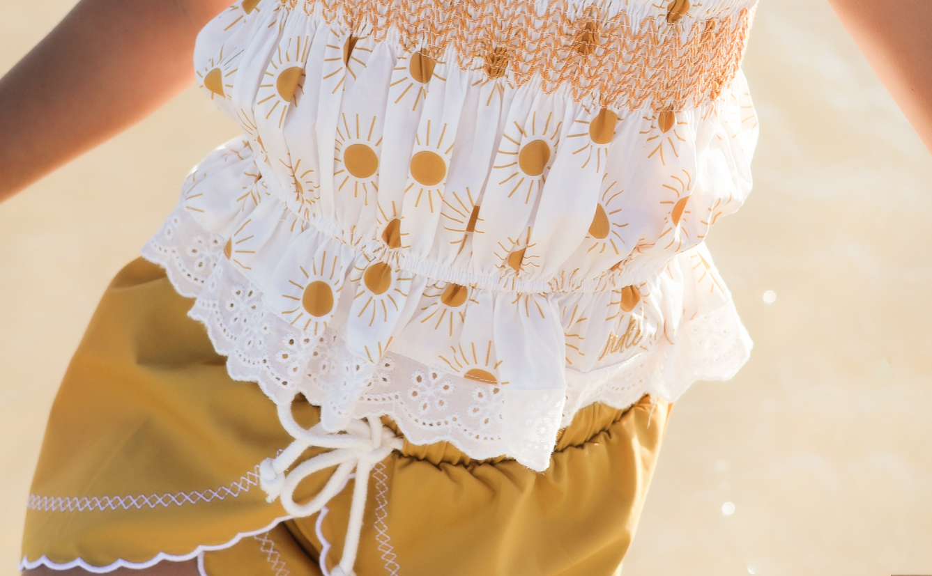 Alice Smocked Top & Petal Shorts Set (gold suns) FINAL SALE
