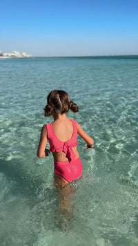 The back steals the show in this stunning two-piece in a gorgeous bright pink hue. The top is securely made as a one-piece with a faux tie. Pair this set with our other sets for a fun mix & match swim wardrobe!