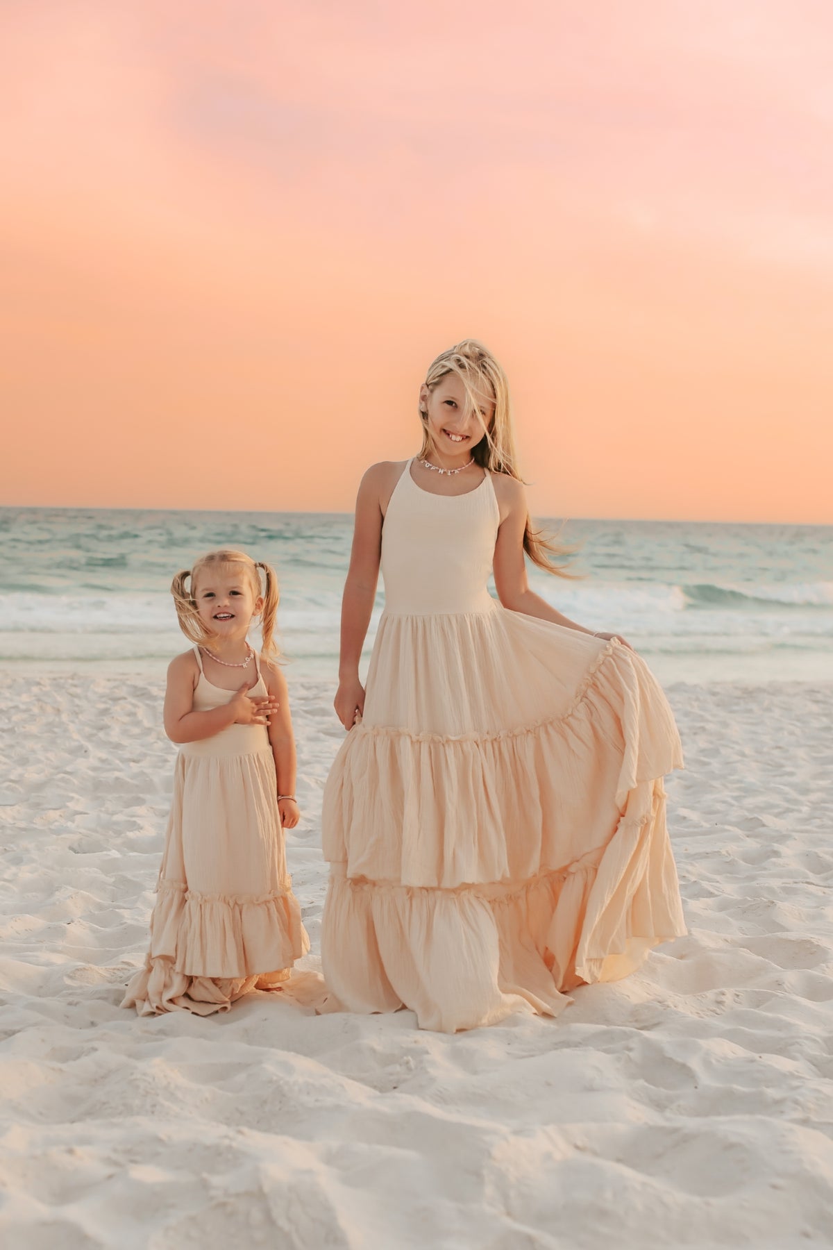 Our Sand Muslin is a soft, sun-washed ivory with a peachy-beige undertone kissed by golden light—earthy, natural, and timelessly dreamy.