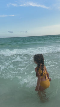 The back steals the show in this stunning two-piece in a gorgeous bright gold hue. The top is securely made as a one-piece with a faux tie. Pair this set with our other sets for a fun mix & match swim wardrobe!