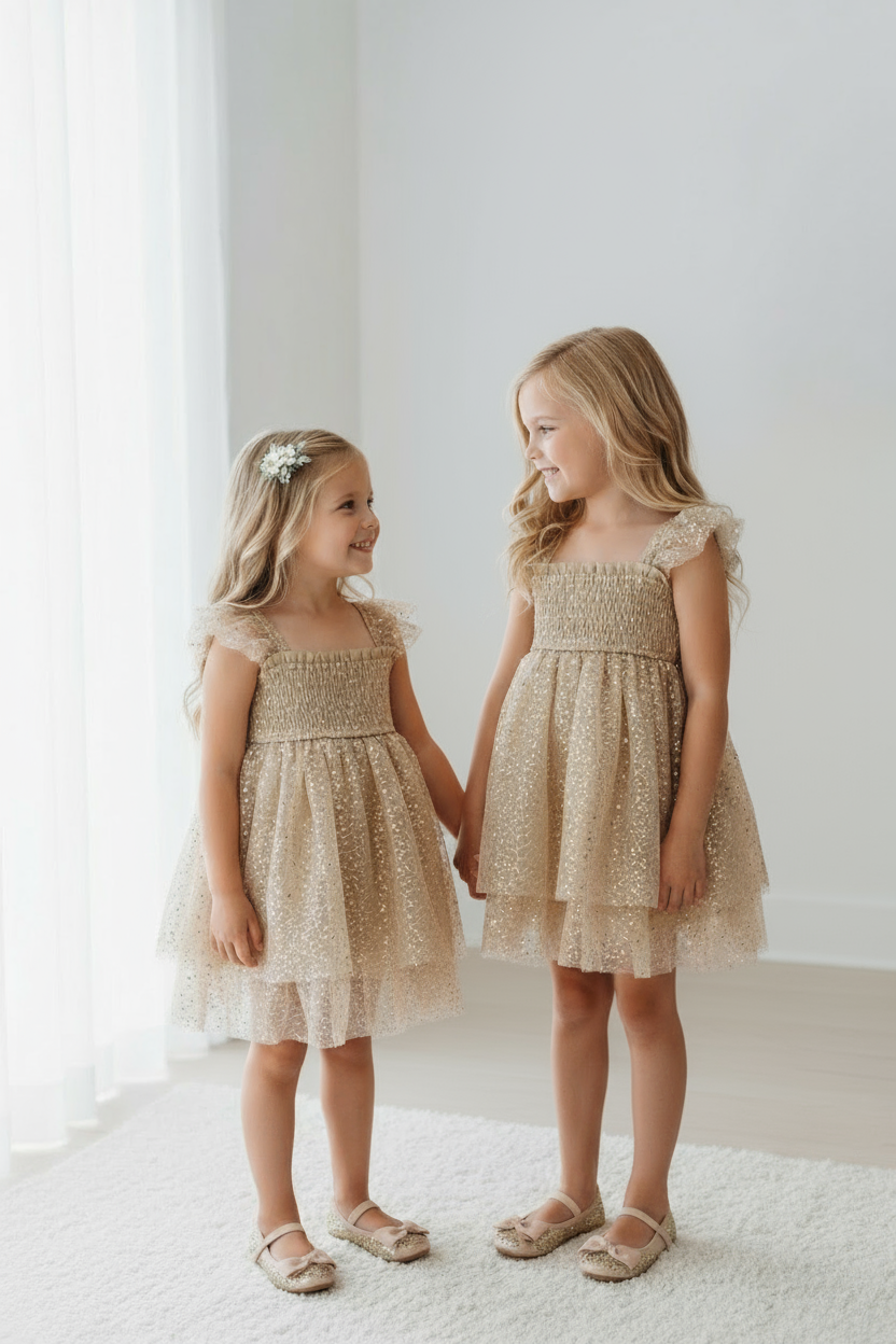 Crafted with dainty flutter sleeves, a beautifully smocked bodice, and tiered tulle layers, Juliet is truly a standout. The cotton liner and luxurious sequin tulle are both soft and comfortable—designed for all-day wear and magical memories.