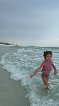 The back steals the show in this stunning two-piece in a gorgeous violet hue. The top is securely made as a one-piece with a faux tie. Pair this set with our other sets for a fun mix & match swim wardrobe!